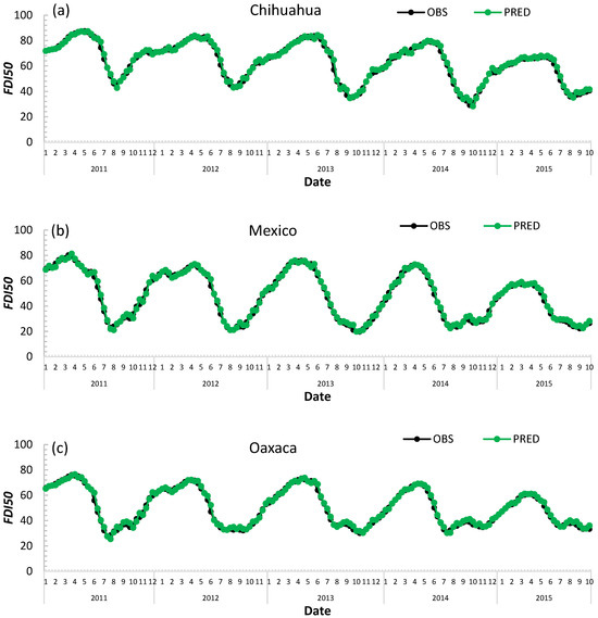 Selected examples of observed and predicted accumulated fuel dryness FDI50 for the states of Chihuahua (a), State of Mexico (b), and Oaxaca (c).