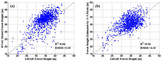 (a) Cross-validation plot of the RVoG model forest height estimation results with the LiDAR product. (b) Cross-validation plot of the third-order FL model forest height estimation results with the LiDAR product.