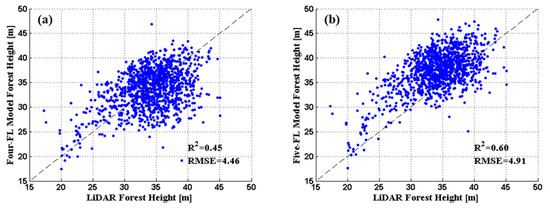 The root-mean-square error (RMSE) is widely used for accuracy assessment in tasks such as forest canopy height inversion [31]. In order to further analyze the performance of the different models, the root-mean-square error (RMSE) was calculated with respect to the LiDAR forest height product. A total of 1170 forest stands were uniformly selected, where the size of each stand was 51 × 51 pixels [20,30,31]. The RMSE of the RVoG model is 5.28 m, and the RMSE of the third-order FL model with 3 × 3 neighboring pixels is 4.32 m, which are shown in Figure 3. The accuracy of the forest height estimation by the third-order FL model is improved by 18% when compared with the RVoG model. According to the RMSE, it can be stated that the third-order FL model is superior to the RVoG model in forest height estimation. The tree species in the Mabounie area are mainly tropical species, and the vertical distribution of the canopy scatterers can be complicated. Meanwhile, in the field of low-frequency radar, the forest scatterers are branches with anisotropy. In this configuration, the hypothesis of a uniform canopy, as required by the RVoG model, may no longer be appropriate. In contrast, the forest vertical profile described by the third-order FL polynomials is more consistent with the forest at Mabounie.