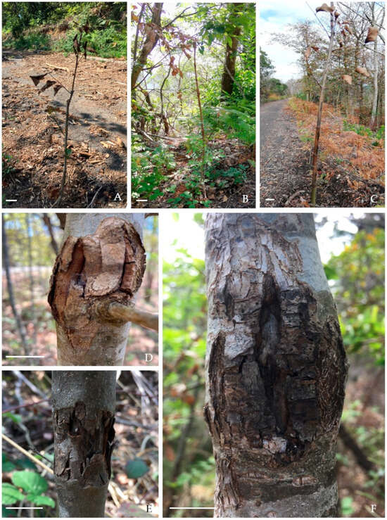 Fraxinus ornus individuals with symptoms of decline/dieback in the field (A–F); scale bar = 5 cm. Mortality of natural regeneration, with evident crown desiccation and cankers on the stem (A–C). A canker on the stem originating at a dead branch, with discolored bark and callus formation (D); sunken canker with cracked areas girdling the stem (E); a swollen canker with cracked areas on the bark (F).