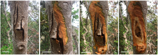 Visual representation in sequence of a longitudinal canker on a Fraxinus ornus trunk (A), subjected to progressive removal of the outer bark (B–D) to show the extension of the necrotic tissues throughout the inner bark (secondary phloem); scale bar = 5 cm.