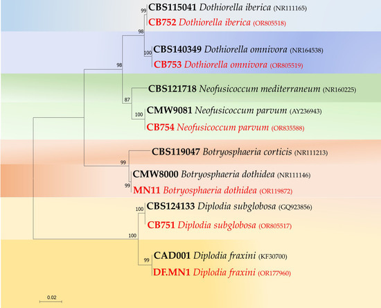 Maximum likelihood tree obtained from Internal Transcribed Spacer (ITS) sequences of Botryosphaeriaceae species. The tree is drawn to scale (0.01), with branch lengths measured in the number of substitutions per site. Bootstrap support values in percentage (1000 replicates) are given at the nodes. Ex-type cultures are in bold, and isolates obtained in this study in red.