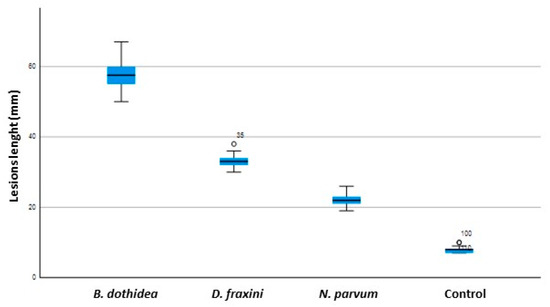 Graph depicting the extent of lesions produced on seedlings by artificial inoculation with B. dothidea, D. fraxini and N. parvum, compared to the control. Boxes represent the interquartile range, while the horizontal line within each box indicates the average value.