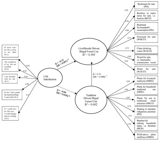 A structural model testing the hypothesized relationships between life satisfaction and illegal forest use was used to assess model fit. Whereas measurement models are usually used to explore the relationship between constructs and their measured items, structural equation models are typically used to explore the relationships between constructs []. The structural model was found to have a minimal but adequate fit to the data (CFI = 0.90, RMSEA = 0.080, RMSEA range: 0.076–0.089) []. Consequently, because the model had an adequate fit to the data, we assessed the strength of the relationship between perceived life satisfaction and illegal forest use.