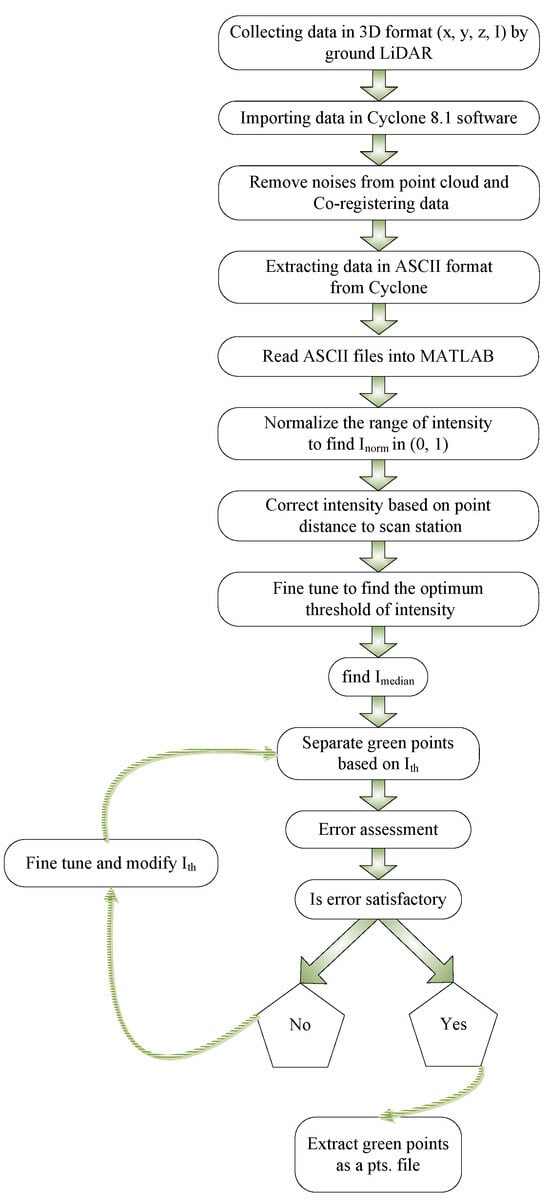 Three techniques have been proposed for separating photosynthetic and non-photosynthetic materials in tree PCD. The first method involves manual separation by the operator using visual color-based recognition and the geometrical distribution of points, with the assistance of a 3D demonstration software [39,40,41,42]. However, this technique is time-consuming and prone to user error due to the large number of scattered points forming various geometries. As a result, alternative automated techniques have been developed. The second approach employs statistical tools like eigenvalues, conditional probability functions, and Gaussian mixture models to identify leaf geometry [26,43,44,45,46,47,48]. A potential drawback of the geometry identification method is that the LiDAR scanning process may undersample many leaves, resulting in only a few points representing them. Recently, an alternative method has been proposed that utilizes point “intensity” to identify photosynthetic material from non-photosynthetic material [2,49,50,51,52,53]. Point intensity is a measurement provided using the LiDAR in addition to the Cartesian coordinates of a point (x, y, z). It is defined based on the amount of laser beam reflection received at the LiDAR scanner, influenced by various factors such as the material composition of the hit point, laser wavelength, incidence angle, and distance between the laser scanner and the hit point [54].