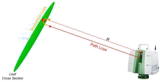 The intensity of the received laser beam from the hit point depends on the total power loss it undergoes during its two-way travel from the laser source to the hit point and back from the hit point to the laser source and target. The path loss is proportional to the squared distance (R2) and is known for every point in the PCD. Path loss is indicated by two red arrows extending from the LiDAR to the hit spot on the leaf and from the hit spot back to the LiDAR, as shown in Figure 3. Absorption loss depends on the water, pigment, and physical properties of the surface. Since leaf and wood tend to have different ranges of water, pigment, and scattering characteristics, absorption loss can be used to identify photosynthetic from non-photosynthetic components. This is indicated by the orange bouncing arrow over the leaf (Figure 3). Absorption loss should be distinguished from path loss to separate the wood from the leaf.
