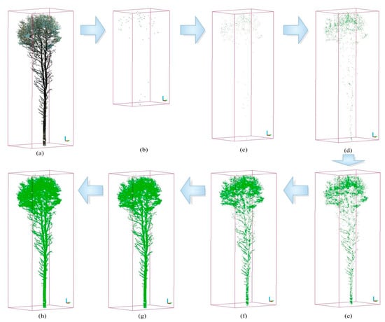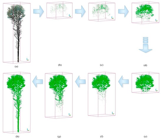 Illustration of the separation of photosynthetic components using the proposed algorithm with TLS data at various intensity thresholds. The raw point cloud for a single tree is shown in (a). (b–h) show the point clouds of the separated photosynthetic components with different intensity thresholds, namely 250, 200, 90, 80, 70, 50, and 20.