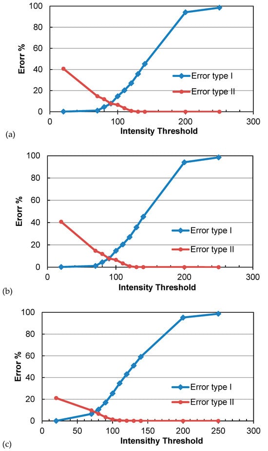 In this section, the effectiveness of the proposed algorithm in distinguishing between photosynthetic and non-photosynthetic components is evaluated using three PCD of trees during the summer season. The absorption loss varied from 0 to 500, with most values being below 300. The optimal threshold for I_absorption was determined by fine-tuning a range of intensity thresholds, including 250, 200, 90, 86, 70, 50, and 20, as shown in Figure 4. The OIT was then determined by minimizing the commission and omission errors using the proposed algorithm over 21 trees. The average error rates for the type I and type II errors were 5.7% and 4.8%, respectively. Figure 5a–c illustrate the commission and omission errors for the three sample trees (I, II, and III) in the study plot. For instance, the omission error for tree I varied between 2.4% and 99%, whereas the commission error ranged from 0.0008% to 82.8%, as shown in Figure 5a. The OIT values for trees I, II, and III were 80, 90, and 75, respectively.