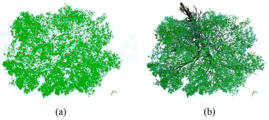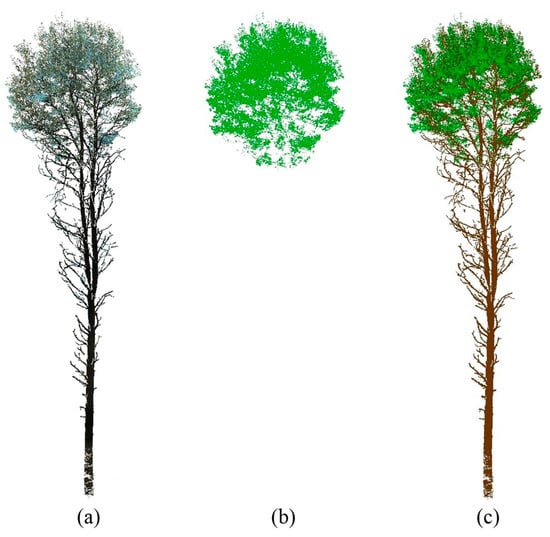 The performance of the separation method was assessed using qualitative and quantitative analyses. Qualitative analysis was conducted using 3D PCD demonstration software version 2.6.3 such as Cloud Compare. Both the entire PCD and the separated points were loaded in different colors for visual comparison [70,71,72]. Additionally, the PCD from the leaf off-season were used as a reference for visual comparison with the separated points.