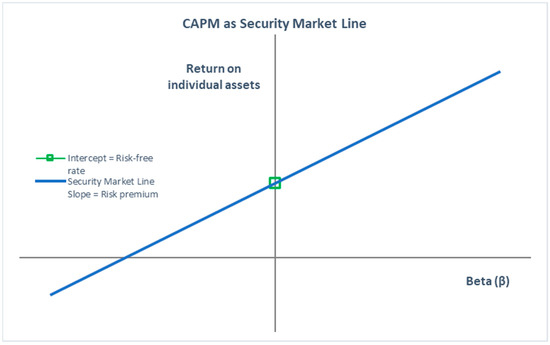 The CAPM assumes the canonical form of a linear equation, y = b + mx. Plotting return against beta reveals the security market line (Dybvig and Ross, 1985) [56]. Figure 1 presents the security market line when its slope indicates the risk premium, and its intercept is the risk-free return (Chen, 2021) [49]. Higher degrees of leverage commensurately lead to higher levered betas and, thus, a higher cost of equity.