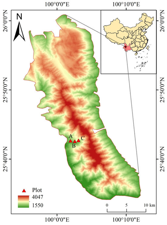 The research sites are located on Cangshan Mountain (25°70′11″ N, 100°04′56″ E) in southwestern China. The elevation of the plot ranged from 2503 m above sea level (asl) to 2895 m asl (Figure 1). Cangshan Mountain has a temperate climate with a mean annual temperature of 16.1 °C. The region undergoes a distinct seasonal shift, with a pronounced rainy season extending from May to October, followed by a dry season commencing in November and persisting until April of the following year. The mean annual precipitation is 1059 mm, and the rainy season accounts for 80% of this total [35]. In the year 2020, we established three forest dynamics plots of 0.09 hectares (30 m × 30 m) each. All woody species (diameter at breast height (DBH) ≥ 1 cm) were tagged, identified, and measured [36].
