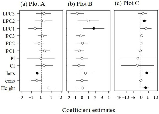 In plots B and C, the significant coefficients of LPC1 and LPC2 were smaller in Model III (without habitat variables) than in Model IV (with habitat variables; Table 2). In addition to the LPC2 of plot C, we found that adding habitat variables also increased the variance explained by functional traits, whereas variances explained by random effects remained constant (Table S5).