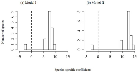 A comparison of the frequency distribution of species-specific coefficients of heterospecific seedling density between Model I and Model II in plot C. Bars to the right of the dashed zero line indicate species whose survival is increased by increasing heterospecific population density. (a) Model I (density model without habitat variables) and (b) Model II (density model with habitat variables).