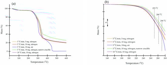 Effect of different measurement conditions over the course of thermal decomposition for unmodified oak wood (a); magnification of these curves in a temperature range from 130 °C to 300 °C (b). In (b), the curves shown in (a) were set to the same starting point of 130 °C.