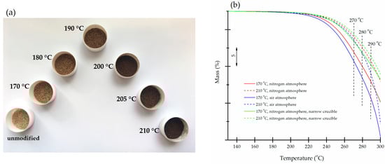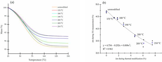 Thermally treated samples rehydrated when exposed to ambient atmosphere. Samples with lower degrees of modification have a higher content of hemicelluloses. They are more hydrophilic and show a higher tendency to adsorb moisture. The TG curve of this type of sample shows a greater mass loss from room temperature up to 130 °C, where the dehydration process is complete. Figure 2a shows TG curves of milled oak samples modified at different temperatures (for clarity, the temperature range is shown from 25 °C to 150 °C). The curves were measured at a heating rate of 5 °C/min under a nitrogen atmosphere, and the initial masses were about 10 mg. Before the measurements, approximately 10 mg of the milled sample was weighed into the 100 μL aluminium crucible and placed in a humidity-controlled chamber for 3 days. The chamber contained a saturated KNO3 solution at approximately 98% humidity at room temperature []. After humidification, the samples were quickly hermetically sealed with a lid that was pierced with a needle just before measurement. In this way, we were able to avoid mass changes due to fluctuations in ambient humidity.