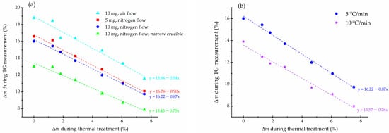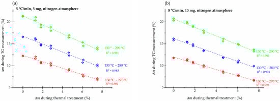 In Figure 5b, we compared the linear coefficients of the calibration curves of samples, obtained from the TG measurements in the temperature range from 130 °C to 280 °C with an initial mass of 10 mg in a nitrogen flow. The only variable parameter was the heating rate. The calibration lines show that a higher linear coefficient is obtained in the case of a slower heating rate of 5 °C/min since more time was available for the chemical reactions to occur.