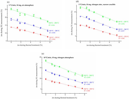 (a–e) Calibration curves (dependence of sample mass loss on mass loss during previous thermal treatment) under different conditions of TG measurements and different temperature ranges, i.e., from 130 °C to 270 °C, from 130 °C to 280 °C and from 130 °C to 290 °C, respectively.