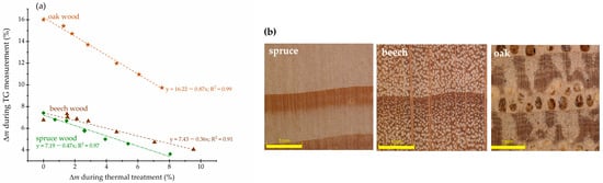 In the end, we were interested in comparing the calibration lines for three different wood species: Norway spruce (Picea abies), European beech (Fagus sylvatica) and pedunculate oak (Quercus robur). The results for the first two species have already been published [,]. They are shown in Figure 6a; for all three samples, the left axis represents the mass loss in TG measurements in the temperature range between 130 °C and 280 °C. The starting point and slope of the lines for spruce and beech wood are similar, while a slightly lower mass loss in this temperature range is exhibited by the spruce samples (compared to beech wood, thermally treated to the same degree; the latter has a slightly lower content of hemicelluloses and cellulose and a higher content of lignin—Table 4). However, the oak samples show significantly higher mass losses. The lignin content is the highest in these samples, while the hemicellulose content is the lowest—see Table 4. The mass loss is attributed mainly to the loss of hemicelluloses, which are considered to be the most thermally sensitive components of wood cell wall polymers, and it is greater for hardwoods compared to softwoods treated under identical conditions. Degradation of hemicelluloses has been observed at temperatures around 100 °C when wood was heated for extended periods of time (48 h) []. The reasons for explaining such a behaviour might lie in the morphology of the wood; oak wood has many pores with elongated shapes, up to 300 μm in their largest dimension (Figure 6b). The other reason could be that during the TG measurements in this temperature range (130–280 °C), lignin predominantly decomposes [].