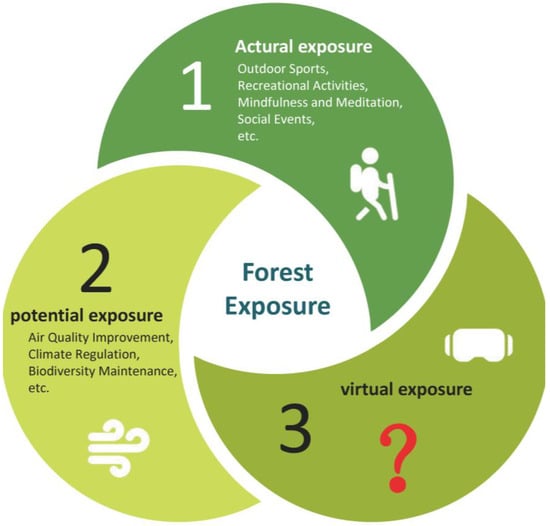 We classified forest exposure into three categories: actual, potential, and virtual. Actual exposure may involve modes such as outdoor sports, social activities, and five-sense experiences [32,33,34]; potential exposure may involve the climate regulation effect of forests and air purification [35,36]; however, the role of virtual forest exposure in the overall scheme of forest exposure and its effect on human health is unclear (Figure 1). With an increase in the number of virtual nature studies, an increasing number of reviews and meta-analyses have supported the existence of a link between virtual nature exposure and health [37,38]. However, no study has elucidated and reviewed the health benefits of virtual forests from a holistic and process-wide perspective. First, although several reviews have addressed real forest experiences [39], the number of reviews on virtual forests as a new research area remains relatively small. Second, a few previous reviews have included both real and virtual forests, considering them together for discussion [40]; however, regardless of real and virtual forests sharing certain elements, virtual is nevertheless a replica of the real, whereby a certain amount of information loss is inevitable in the process of replication, and the two may have different potential mechanisms of action in terms of health benefits. Additionally, existing reviews frequently combine various types of natural environments and discuss them. A few reviews have frequently used the term NATURE, thus considerably broadening the scope of research, including forests, water bodies, deserts, parks, beaches, underwater, spaces, and several other types of nature [38]. Owing to the diversity of types of nature, certain studies may not be comparable.