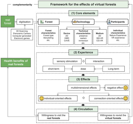 This study presents a conceptual framework for the multidimensional effects of virtual forests. A comprehensive review of the existing research on the effects of virtual forests was conducted to identify the influencing factors and mechanisms and refine the key themes. With reference to, but different from the conceptual frameworks proposed by real forest therapy, naturopathy, and nature exposure [46,49], we constructed a conceptual framework of the entire process from the perspective of “core element-experience-effects-circulation” for virtual forests (Figure 2). The three core elements of virtual forest exposure are the forest (forest type, storytelling, etc.), technology (device, medium, technical characteristics), and participants (sociodemographic, natural experience, VR experience, etc.). The experiential processes include sensory stimulation, interaction, and dosage. The effects include individual-oriented (physiological, emotional, and cognitive), connection-oriented (social, ecological, and transcendental), and negative (motion sickness). Circulation then includes the intention to revisit the virtual or real forest. There are interdependencies among these four categories. The design and selection of core elements directly impact user experiences, which, in turn, influence the effects. Simultaneously, the positivity and sustainability of the effects reciprocally affect user engagement and the circulation process. Thus, these four categories form an interconnected cyclic system, working together to facilitate the realization and ongoing development of health benefits in the virtual forest. The framework not only reflects the entire process of revealing the multidimensional effects of a virtual forest from a holistic perspective but also establishes a connection with the real forest, constituting a virtuous circle. The specific elaboration of the framework and the supporting research is shown in the Section 4.