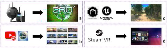Sources of virtual forests. (a) Example of 360-VR captured using panoramic cameras (e.g., insta360) [58]; (b) Virtual forest footage from the internet (e.g., YouTube) [59]; (c) CG-VR using modeling software (e.g., Unity 2019, Unity Software Inc., San Francisco, CA, USA) [60]; (d) Electronic games on platforms (e.g., Nature Trek VR) [54].