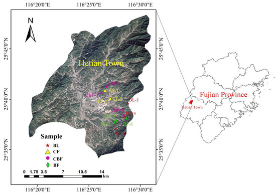 As shown in Figure 1, the experimental site is situated in Hetian Town, Changting County, Fujian Province, China (116°25′57″–116°30′36″ E, 25°37′18″–25°44′02″ N). It has a subtropical humid monsoon climate, with plentiful rainfall throughout the year. The annual average temperature is 17–19.5 °C, and the annual average precipitation is 1700 mm. The vegetation type is subtropical evergreen broad-leaved forest, with the main vegetation including Pinus massoniana, Schima superba, Liquidambar formosana, Cinnamomum camphora, and Dicranopteris dichotoma. As a typical red soil area, the soil is severely desilicated and enriched in aluminum. The clay minerals are mainly kaolinite, and the soil is acidic with low salt saturation. Long-term soil erosion has inflicted severe damage on the ecological environment of Changting. According to the 1985 remote sensing survey, the soil erosion area of Changting County accounts for 31.5% of the total land area, with a soil erosion modulus of 5000–12,000 t·km−2, and vegetation coverage of 5%–40%.