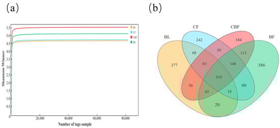 As shown in Figure 2, the Shannon–Wiener index curve tended to flatten out (Figure 2a), and the library coverage rate was greater than 99%, indicating that the sequencing data were sufficient to reflect the true situation of soil fungal communities in different vegetation types during the restoration stages. The number of soil OTU in different vegetation types during different restoration stages showed an increasing trend, with BF > CF > CBF > BL. However, there was little difference between the CF and CBF types, with the BF types being 1.26, 1.15, and 1.16 times higher than BL, CF, and CBF, respectively. The unique OTU content in the BL, CF, CBF, and BF vegetation types of soil was 277, 242, 184, and 386, respectively, showing a trend of first decreasing and then increasing, with the BF type reaching its maximum value (Figure 2b).