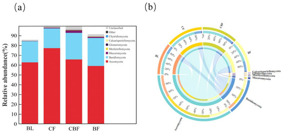 Figure 3. Phyla-level composition of soil fungi phylum in different vegetation restoration types. (a) Bar chart of soil fungal composition. (b) Visual circle of soil fungal composition. The upper half of the circle represents the fungal composition during different vegetation restoration stages, the outer colored band represents different vegetation restoration stages, the inner colored band represents different fungal species, and the length of the colored band represents the relative abundance of the species during the vegetation restoration stage. The lower half of the circle represents the distribution proportion of different species in different vegetation restoration stages at the taxonomic level. The outer colored band represents different species, the inner colored band represents different vegetation restoration stages, and the length of the colored band represents the distribution proportion of the species in the vegetation restoration stage. BL: bare land; CF: coniferous forest; CBF: conifer-broad-leaved forest; BF: broad-leaved forest.