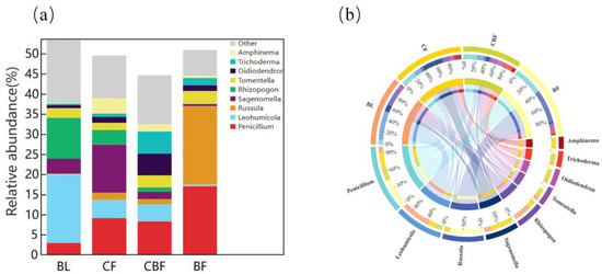 Figure 4. Genera-level compositions of soil fungi in different vegetation restoration types. (a) Bar chart of soil fungi in classification level composition. (b) Visual circle of soil fungal composition. BL: bare land; CF: coniferous forest; CBF: conifer-broad-leaved forest; BF: broad-leaved forest.