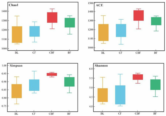 Figure 5. Alpha diversity of soil fungi in different vegetation restoration types. BL: bare land; CF: coniferous forest; CBF: conifer-broad-leaved forest; BF: broad-leaved forest.