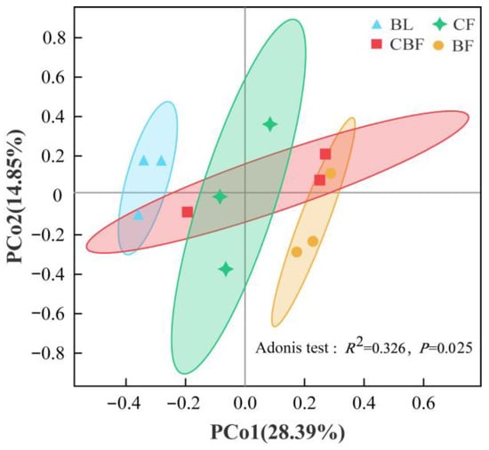 Figure 6 shows the principal coordinates analysis (PCA) of soil fungi based on the Bray–Curtis distance and combined with the non-parametric Adonis (permanova) test. The soil fungal samples of the BL, CF, and BF types had no overlapping areas, while the Bray–Curtis distance of the samples was relatively far, indicating significant differences in the soil fungal community structure during the BL, CF, and BF stages (R2 = 0.326, p = 0.025). The CBF type soil fungal samples had overlapping areas with the BL, CF, and BF types, and Bray’s distance was relatively close, suggesting that the community structure of CBF closely resembled that of BL, CF, and BF.