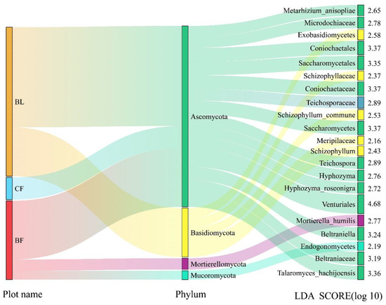 Figure 7. Indicator species analysis of different vegetation restoration types. The left image shows the evolutionary branch of fungal species, while the right image shows the LDA score. BL: bare land; CF: coniferous forest; BF: broad-leaved forest.