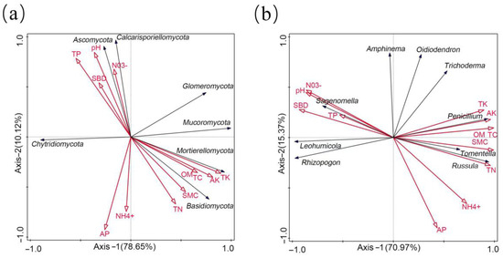 Figure 8. Redundancy analyses of fungal phylum and genus classification levels and soil physicochemical properties in different vegetation restoration types. (a) The classification level of the phylum fungi. (b) The classification level of the genus fungi.