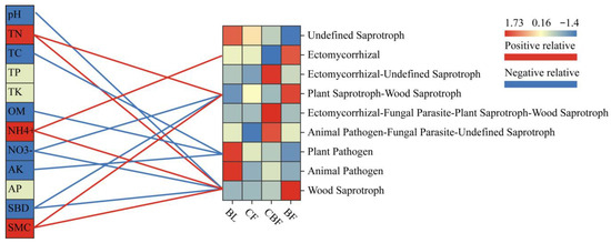 A correlation analysis showed that soil TN, NH4+, and SMC were significantly positively correlated with fungal functional abundance. Additionally, plant saprophytic fungi—wood saprophytic fungi were positively correlated with soil TN and SMC, while wood saprophytic fungi were positively correlated with soil TN, NH4+, and SMC. There was a significant negative correlation between soil pH, TC, NO3, AK, and BD and soil fungal functional abundance.
