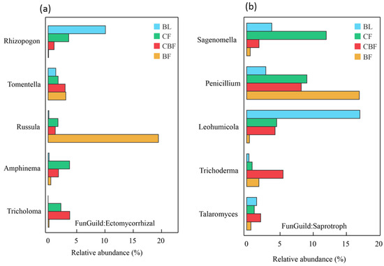 Figure 10. Relative abundance of (a) ectomycorrhizal fungi and (b) saprophytic fungi in different vegetation restoration types. BL: bare land; CF: coniferous forest; CBF: conifer-broad-leaved forest; BF: broad-leaved forest.