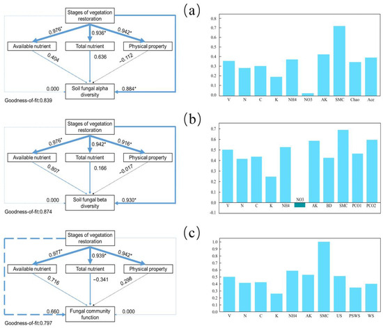 Figure 11b shows that there was a significant positive effect relationship between typical vegetation types and soil total nutrients (0.942), available nutrients (0.976), and soil physical properties (0.916) during vegetation restoration. There was a positive effect relationship between soil fungal Beta diversity and vegetation restoration types (0.930), total nutrients (0.166), and available nutrients (0.807), and a negative effect relationship with soil physical properties (−0.017). Figure 11c shows that there was a significant positive effect relationship between vegetation restoration types and total soil nutrients (0.939), available nutrients (0.977), and soil physical properties (0.942).
