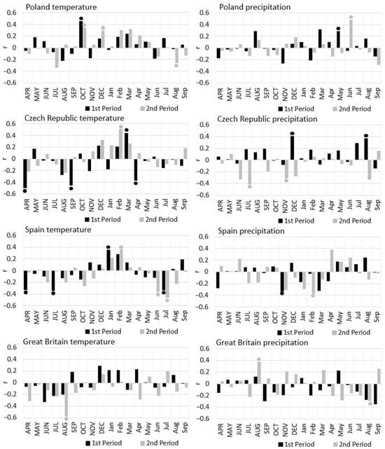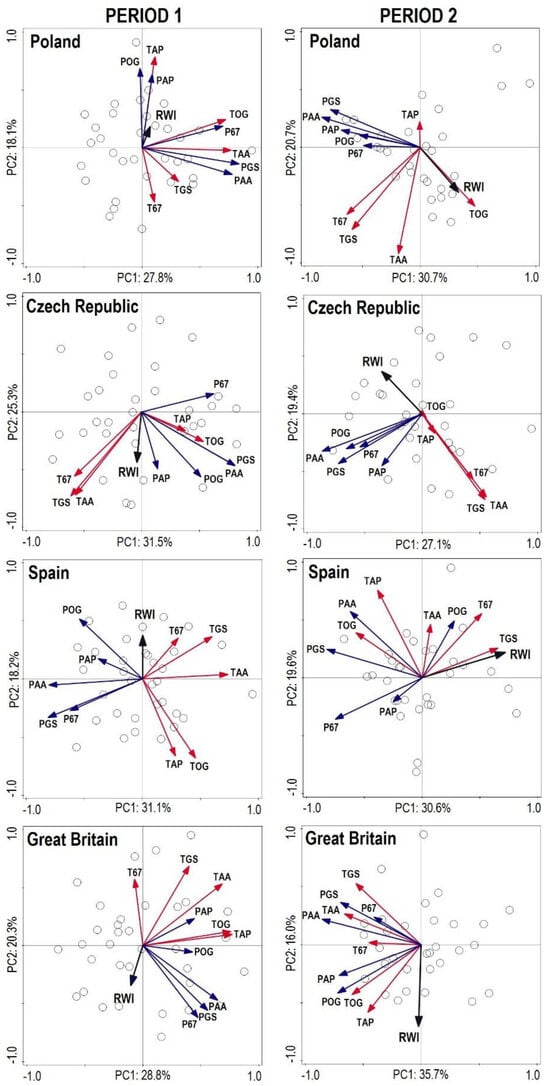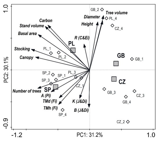 from each record were relatively distant from one another, except for Great Britain and the Czech Republic (similarity between the two countries). The lower part of the diagram was typical for stands with high structural and overall diversity, while the upper part of the graph represents areas with a high production potential and carbon sequestration.3.4. Dynamics and Spectral Analysis of Radial Growth