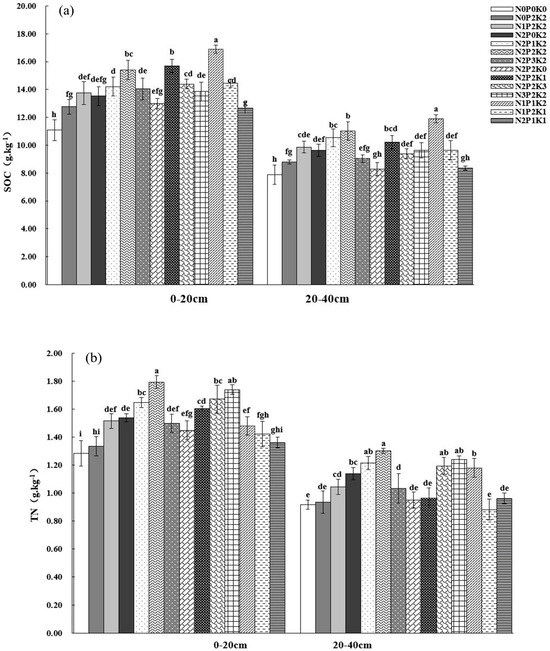 Different fertilization treatments significantly affected soil nutrient characteristics. It was found that increasing N or P application at the P2K2 and N2K2 levels, respectively, significantly reduced soil pH. Probably because the urea treatment (used here for nitrogen application) contributed more to soil acidification [58]. Urea can be rapidly converted to NH4+ by soil bacteria. And, during the oxidation of NH4+, H+ is released into the soil. N application leads to the loss of cations (Ca2+, K+, and Mg2+) in the soil, which are taken up by plants, thereby accelerating soil acidification [59,60,61]. It was found that with the increase in N, P and K fertilizers, the soil organic carbon content showed an increasing and then decreasing trend. This may be due to the transformation process of mineralization and fixation of N, P and K in the soil, and fertilizer application accelerated the uptake of soil nutrients. Some studies have shown that the application of N, P and K fertilizers can increase soil organic carbon, and that the application of N, P and K in pairs or individually can promote the growth of plant roots and increase the input of inter-root organic matter which, in turn, can increase the content of organic carbon [61,62]. However, when fertilizers are applied in excess, it leads to a decrease in total organic carbon content, which may be due to the fact that excess fertilizer application affects the number and activity of soil microorganisms and affects the biodegradation of organic carbon sources [60]. Therefore, in energy forests, attention needs to be paid to the amount and proportion of nitrogen, phosphorus and potassium fertilizers applied.