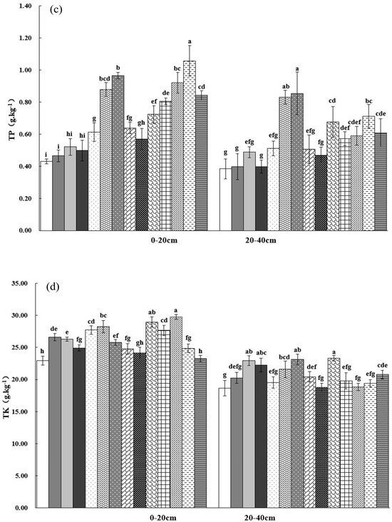 In the 0–20 cm soil layer, except for pH, SOC, TN, TP, TK, AP, AK and AN contents of Sapindus mukorossi soils were higher than those of the control group under the different fertilizer treatments, which increased by 14.25%–52.61%, 3.90%–39.84%, 9.52%–150%, 1.39%–29.67%, 118.58%–407.08%, 5.35%–39.69% and 3.63%–40.41%, respectively, compared with CK. The maximum value of each soil nutrient content was significantly increased by 50.81%, 42.85%, 126.68%, 25.13%, 233.64%, 33.49% and 47.09% in the 20–40 cm soil layer as compared to CK. The increase in TN and AN content in the 20–40 cm soil layer was slightly higher than that in the 0–20 cm, while the increase in the rest of the soil indicators was lower than that in the 0–20 cm. At the levels of P2K2, N2K2, and N2P2, SOC and TN contents showed a trend of increasing and then decreasing with the application of N, P and K in the 0–20 and 20–40 cm soil layers, and the N2P2K2 treatment was significantly higher than N0P2K2, N2P0K2, and N2P0K2. In vertical distribution, SOC, TN, TP, TK, AP, AK and AN contents of Sapindus mukorossi soils under different fertilization treatments decreased significantly with increasing soil depth (p ˂ 0. 05) (Figure 2).