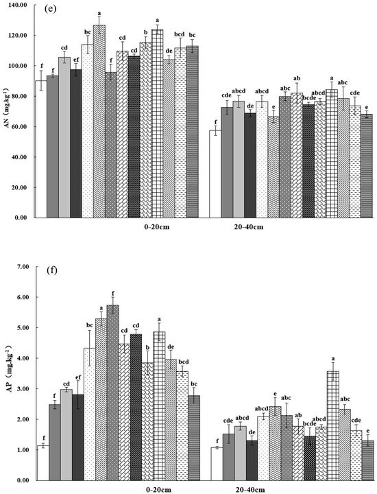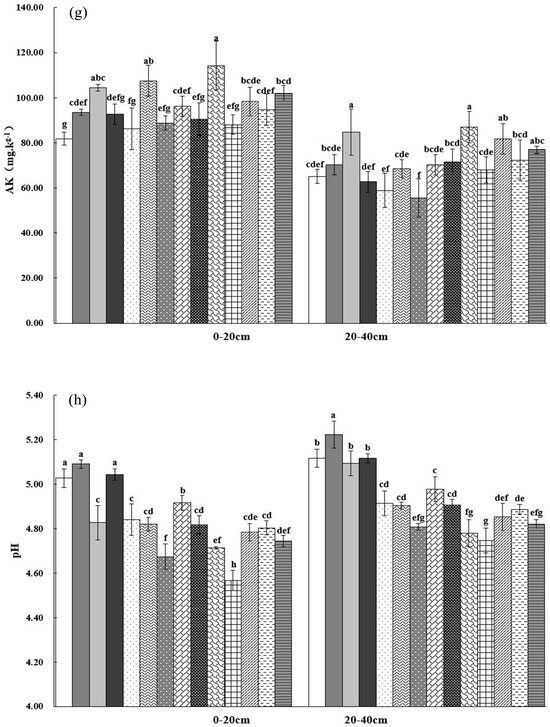 Soil physicochemical properties under different fertilization conditions. Note: (a) SOC: soil organic carbon; (b) TN: total nitrogen; (c) TP: total phosphorus; (d) TK: total potassium; (e) AN: available nitrogen; (f) AP: available phosphorus; (g) AK: available potassium; (h) pH: soil acidity and alkalinity; different lower-case letters indicate significant difference between fertilization treatments at 0.05 level.