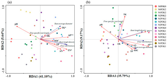 RDA analysis of fine root traits and soil properties in 0−20 cm (a) and 20−40 cm (b) soil layers of Sapindus mukorossi. Note: SOC: soil organic carbon; TN: total nitrogen; TP: total phosphorus; TK: total potassium; AN: available nitrogen; AP: available phosphorus; AK: available potassium; pH: soil acidity and alkalinity. Note: * indicates significant correlation at the 0.05 level; ** indicates significant correlation at the 0.01 level.
