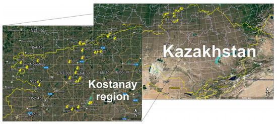 - Ozgeldinova, Z.; Mukayev, Z.; Zhanguzhina, A.; Bektemirova, A.; Ulykpanova, M. Spatial and temporal analysis of landscape dynamics in the Kostanay region under anthropogenic impacts. Arch. Environ. Prot. 2023, 49, 80–94. [Google Scholar]