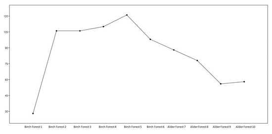 Based on the presented data, the following conclusions can be made: Birch forests have a significantly higher number of taxa and individuals than Alder forests. The highest abundance is observed in the Birch Forest 5 plot (121 taxa and 121 individuals), while the lowest is at Alder Forest 9 (56 taxa and 56 individuals). The Dominance index (Dominance D) is low in all plots, indicating the absence of solid dominance of any species. Birch Forest 5 has the lowest dominance (0.008264), indicating the highest level of evenness. The Simpson index (Simpson 1-D) is high in all plots, confirming the high biodiversity. The highest index is observed in Birch Forest 5 (0.9917). The Shannon index (Shannon H) is also high in all plots, especially in birch forests, with the highest value in Birch Forest 5 (4.796). The Brillouin index is high in all birch forests, especially in Birch Forest 5 (3.823), indicating high diversity and thus a rich and varied ecosystem. The Menhinick index shows significant diversity in all plots, especially in Birch Forest 5 (11.00). The Margalef index confirms the high level of species diversity in the birch forest sites, especially in the Birch Forest 5 site (25.02). The birch forest sites generally show higher biodiversity values than the alder forests, reflected in all indices and quantitative indicators. The most diverse and uniform site is Birch Forest 5. The alder forests have lower species diversity but still show significant biodiversity. The parameters of the number of taxa are presented as a graph in Figure 2.