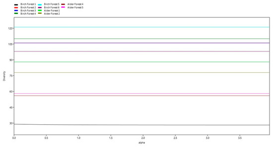 The graph displays the alpha diversity at different sites depending on the alpha parameter. The graph shows that the number of species at all sites, except Birch Site 1 remains constant with changing alpha. Diversity stability: at the sites Birch Site 2, Birch Site 3, Birch Site 4, Birch Site 5, Birch Site 6, Alder Site 1, Alder Site 2, Alder Site 3, and Alder Site 4, the number of species remains stable with changing alpha. Diversity change at Birch Site 1: at Birch Site 1, there is a slight decrease in the number of species with increasing alpha, which indicates a decline in species diversity with increasing alpha.