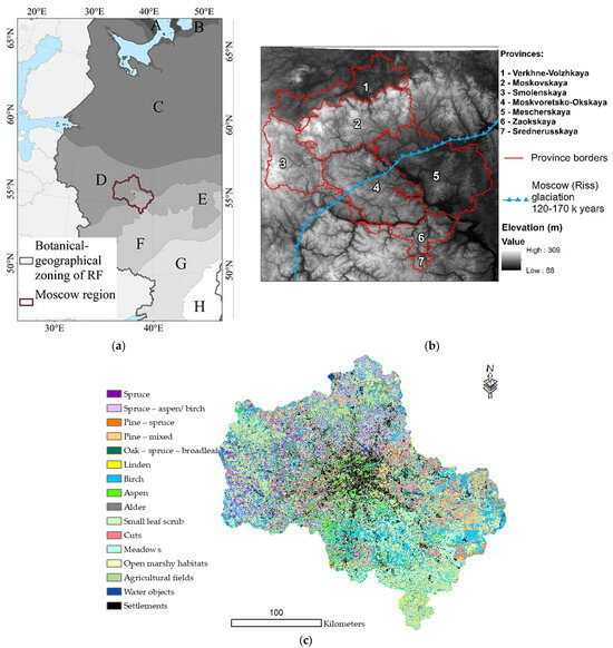 The MR is located in the coniferous–broad-leaved (North)/broad-leaved (South–East) forest zones and forest–steppe (far South), where agricultural lands occupy the major part of the area according to the geobotanical map [24,25,26] (Figure 1a, Table A1).
