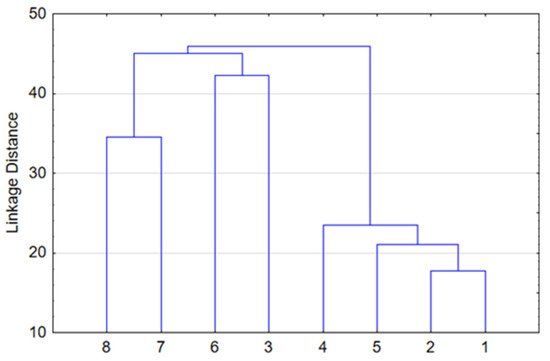 Hierarchical clustering was performed to illustrate the similarity of forest types in terms of floristic composition. The mean percentage of each species within each of the eight forest types was calculated. Based on these data, the Ward method and Euclidean distance squared were applied using STATISTICA 12. Forest types in the lower topography with increased moisturization are well-separated at the upper level (Figure 2). This includes eutrophic grass–marsh communities such as gray alder and black alder forests (#7,8), as well as oligotrophic shrub–sphagnum communities such as pine and small-leaf forests (#3,6). Another group is characterized by zonal spruce and pine forests (#1,2), as well as mesophytic broad-leaf and small-leaf communities (#4,5) found in automorphic positions. At the lower level, species composition homogeneity is naturally observed in coniferous and deciduous forests in automorphic positions.