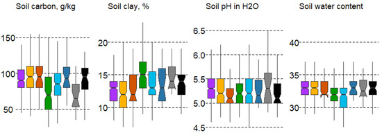 Soil parameters at 10 cm depth were taken from the SoilGrids database (spatial resolution of 250 m) [36]. From the full set of physical and chemical indicators, four were selected as noncorrelated: