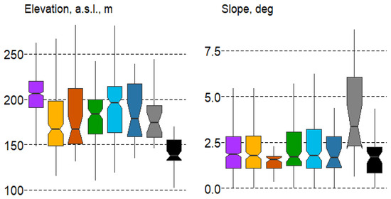 Boxplots of terrain variable variation in forest types with mean values: median, hinges: 1st and 3rd quartile; whisker: largest value no further than 1.5 interquartile ranges; notch: 95% confidence interval. Forest types: 1—spruce, 2—pine, 3—pine swamp, 4—broad-leaf, 5—small-leaf, 6—small-leaf swamp, 7—gray alder, 8—black alder.