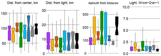 The distance from large settlements does not significantly affect the spatial distribution of forest types. In contrast, the direction from the center of Moscow has a major impact on forest type variation. Differences are significant in almost all forest types. Spruce forests (#1) are confined to the western part of the region, pine and small-leaf swamp forests (#3,6) are typical in the northwestern and northern sectors, gray alder forests (#7) are found strictly in the west, and black alder forests (#8) are typical for the eastern part of the MR. The remaining forest types have a wider distribution across the MR. Nighttime lights (Light ann) significantly differ only for broad-leaf forests (#4), which are more frequently located closer to large cities and often form artificial forest parks (Figure 7).