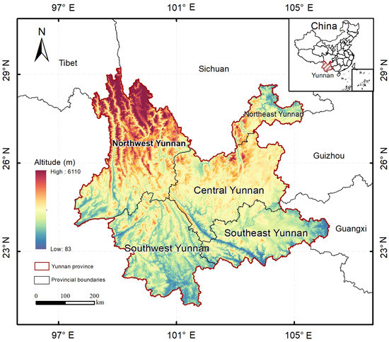 Yunnan Province straddles the tropical, subtropical, and temperate regions of the Northern Hemisphere and exhibits a diverse climate characterized by distinct dry and wet seasons, which is a crucial area for global biodiversity conservation [27] and an essential ecological barrier and ecologically fragile area in China [28]. Yunnan has an average annual precipitation exceeding 900 mm (range 547–2300 mm) in most areas (Yunnan Provincial People’s Government Website). It has a complex and varied topography and is located in the southwestern part of the Yunnan-Guizhou Plateau, with an average altitude of around 2000 m. Population size of 46.73 million as of 2024. It possesses rich vegetation resources due to its diverse ecological and geographical conditions, which serves as an excellent case study for examining the relationship between vegetation cover type structure and climatic drought.